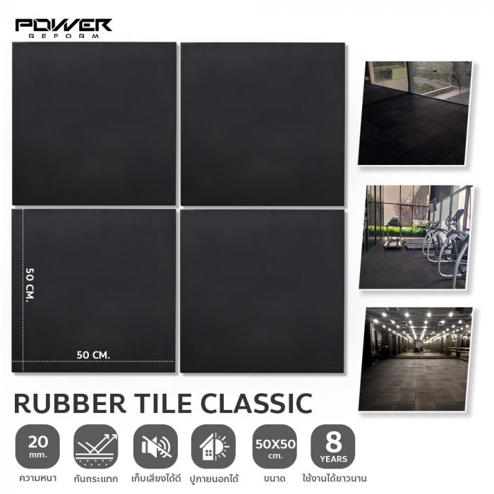 EPDM Rubber Tile หรือ แผ่นยางปูพื้นฟิตเนส EPDM เป็น แผ่นยางกันกระแทก หนา 20 มม. เหมาะสำหรับปูพื้น โซนยกน้ำหนัก Weight Training มีความทนทาน และ หนาแน่นสูง รองรับการทุ่ม ดัมเบล บาร์เบล หรือ แผ่นน้ำหนัก ลงบนพื้นยางได้ ไม่ยุบแม้จะวางเครื่องออกกำลังกายทับเป็นเวลานาน และเก็บเสียงได้ดีมาก