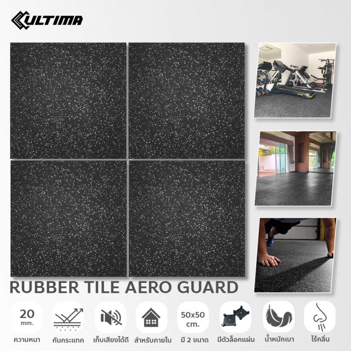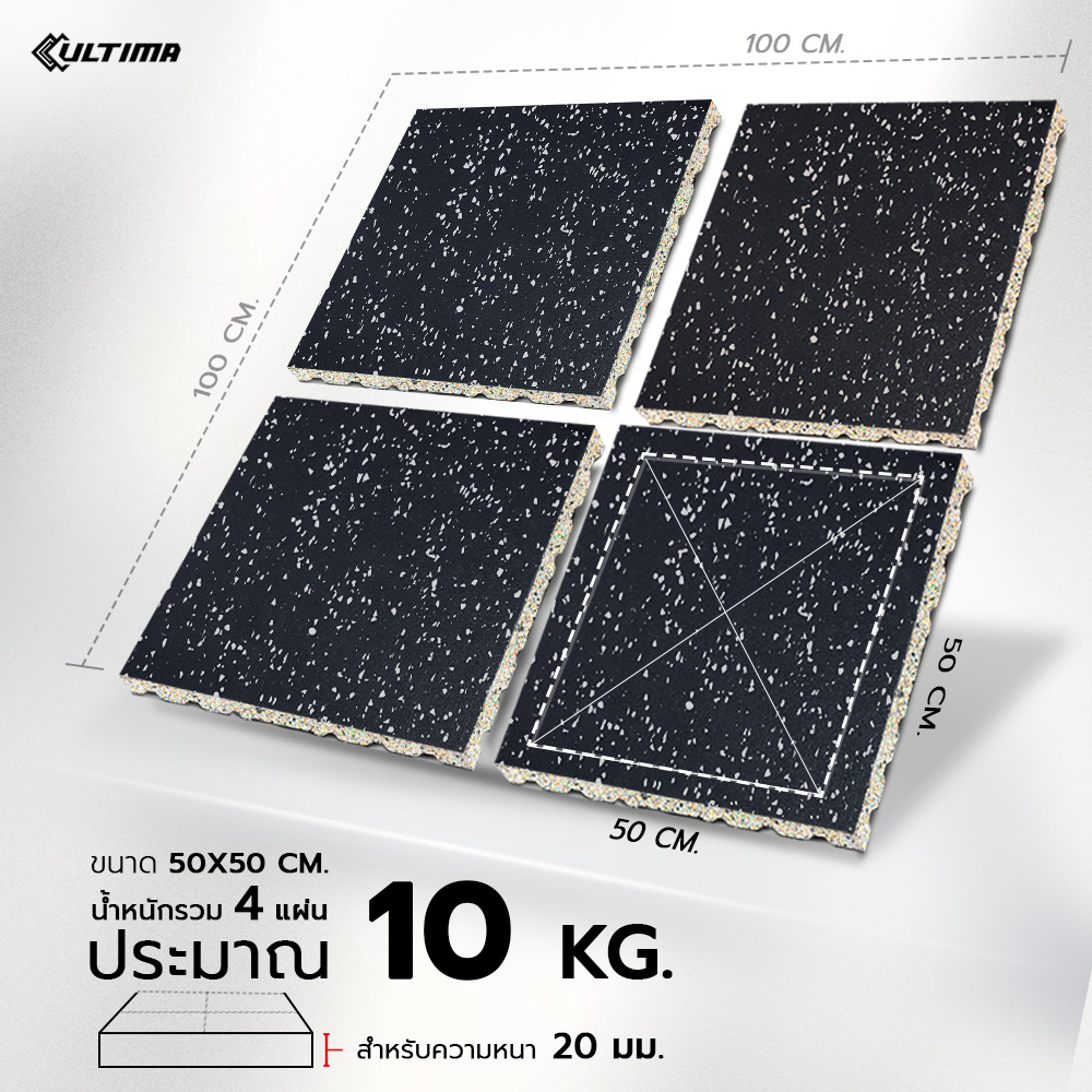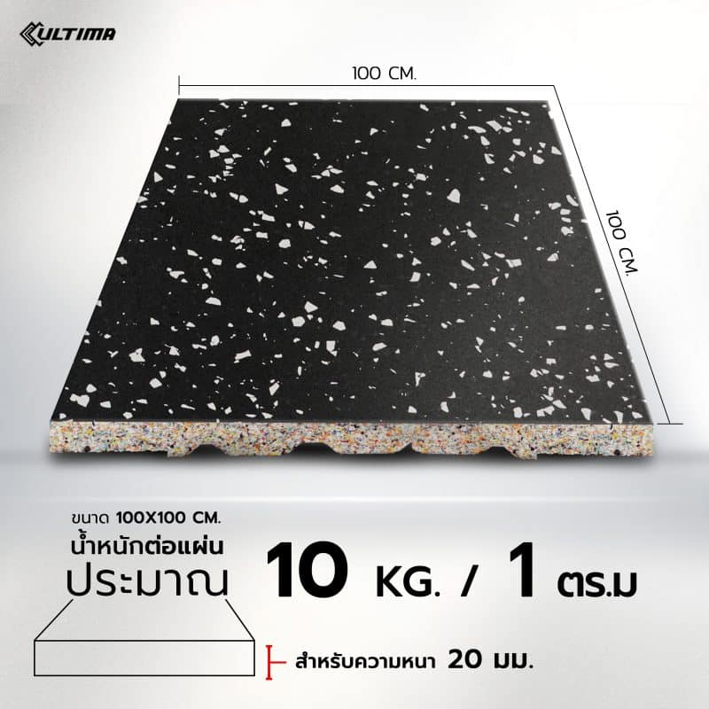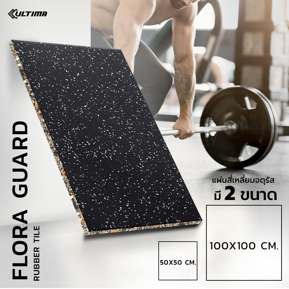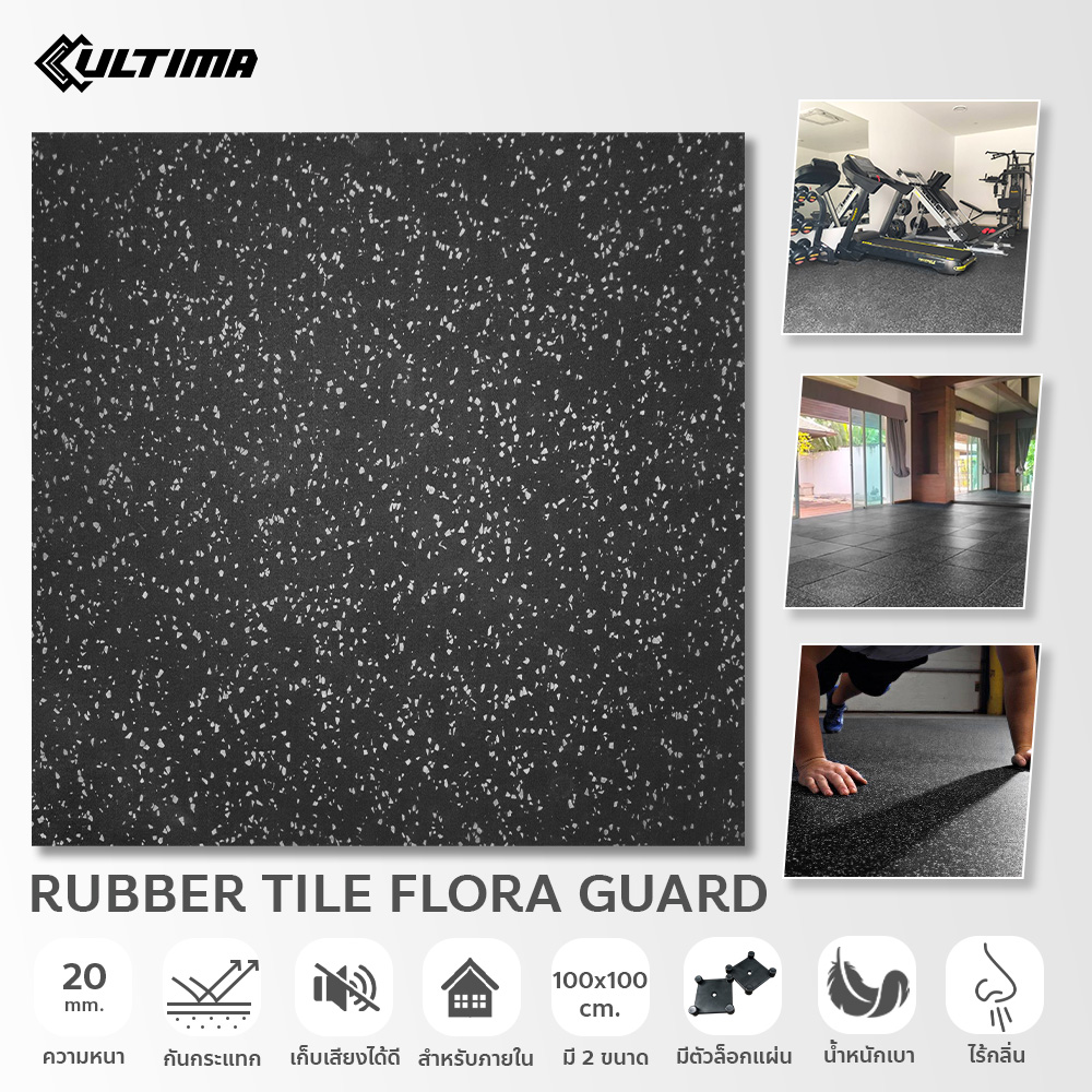 แผ่นปูพื้น Rubber Tile Flora Guard สีดำจุดเทา หนา 20 มม. กลิ่นน้อย ใช้สำหรับติดตั้งภายใน น้ำหนัก 10 กก./แผ่น ติดตั้งง่าย มีขนาดให้เลือก 2 ขนาด 50*50 ซม. และ 1 เมตร x 1 เมตร(100*100 ซม.)