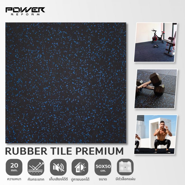 EPDM Rubber Tile Premium แผ่นยางปูพื้นฟิตเนส EPDM หนา 20 มม. พื้นดำ จุดฟ้า เหมาะสำหรับปูพื้น โซนยกน้ำหนัก Weight Training มีความทนทาน และ หนาแน่นสูง รองรับการทุ่มน้ำหนักลงบนพื้นยางได้ ไม่ยุบ เก็บเสียงได้ดีมาก พร้อมตัวล็อค จึงไม่ต้องทากาว และ สามารถระบายน้ำได้อย่างดี จึงใช้ภายนอกอาคารได้อีกด้วย