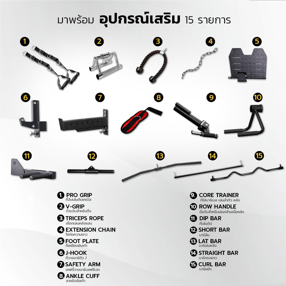 • Dual Weight Stack: มาพร้อมแผ่นน้ำหนักข้างละ 100 kg รวม 200 kg ตอบโจทย์ทั้งการสร้างกล้ามเนื้อและพละกำลัง